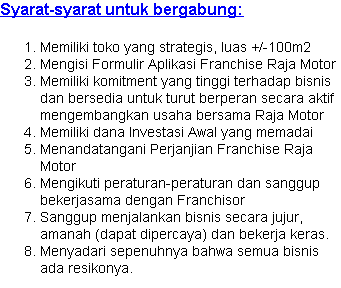 | Nama Franchise RAJA MOTOR | Modal Minimal Rp 305.000.000 | |